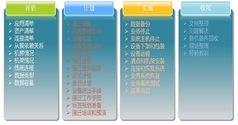 梳理业务系统制定停复机流程,统计数据量制定备份方案,制定搬迁计划并对可能出现的问题制定应急预案。前期进行搬迁内容演练,包括业务停复机、搬迁线路熟悉等项目。对设备清单进行搬迁资产编号,物理搬迁包装满足防水、防尘防震要求。新数据中心布线需要达到即插即用的要求。搬迁前进行搬迁设备标识、提前备份无变化的数据内容压缩备份时间,提供备用人员机制。现场预备搬迁设备的备机备件等。